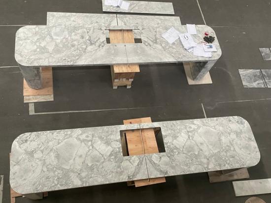 Las imágenes resaltan nuestro meticuloso proceso de fabricación a medida, con recortes funcionales integrados para tecnología y cableado, lo que garantiza un espacio de trabajo limpio y profesional. Las propiedades reflectantes naturales de este material crean un ambiente luminoso y acogedor en cualquier vestíbulo, mientras que su veteado único asegura que cada escritorio sea una pieza irrepetible.