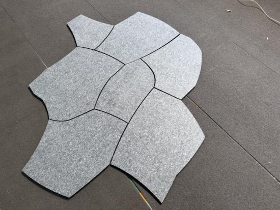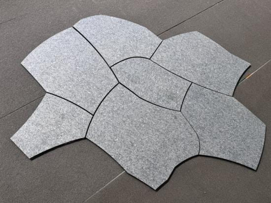 Granito Blue Pearl con corte irregular y losas de granito Granito Blue Pearl de primera calidad con formas de rompecabezas irregulares cortadas con precisión para lograr patrones orgánicos y sin costuras.