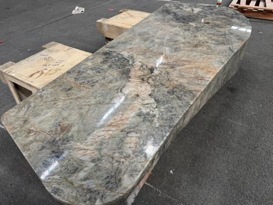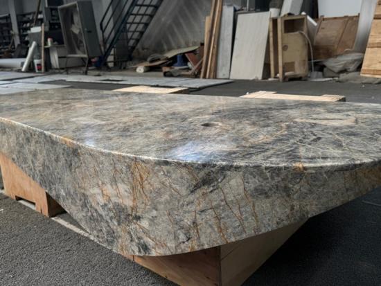 Nuestro proceso de fabricación resalta la versatilidad de la piedra. Las imágenes muestran un perfil sin costuras, de borde grueso y con una silueta curva y aerodinámica, lo que demuestra nuestra precisión en el corte CNC y el acabado a mano. La superficie pulida realza la translucidez natural de los minerales de cuarzo, asegurando que Cuarcita Cielo Sigue siendo un punto focal luminoso en cualquier proyecto de diseño de interiores.