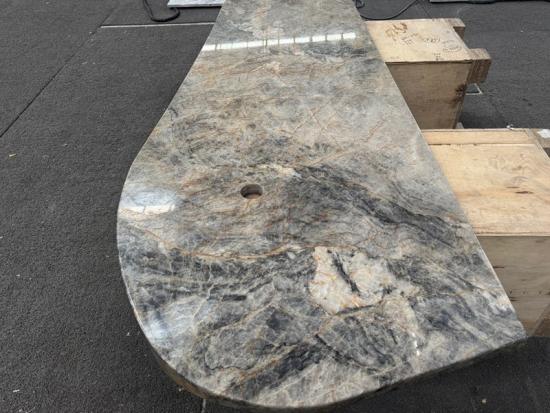 Exótico Cuarcita Cielo Mostrador de recepción procedente de Brasil, con una base azul ahumado y llamativas vetas doradas. Mobiliario de piedra duradero y de lujo, hecho a medida.