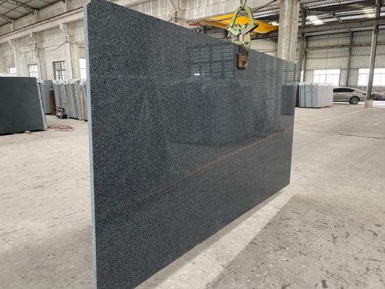 Este granito presenta una base gris densa y de grano fino, salpicada de sutiles motas minerales más oscuras y más claras. Su textura uniforme y sofisticada le confiere una estética moderna y discreta.