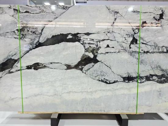 La estética de Mármol de Da Vinci Se caracteriza por sus intensos patrones "brechificados" o "fragmentados". Los depósitos minerales de color gris oscuro y negro crean un poderoso contraste con la base blanco lechosa, a veces acompañados de sutiles áreas cristalinas translúcidas que añaden una notable profundidad a la piedra. Este intrincado entramado la convierte en una opción de primera categoría para instalaciones con simetría de libro donde las losas se combinan para crear paredes decorativas simétricas y de gran impacto en grandes vestíbulos y residencias de lujo.