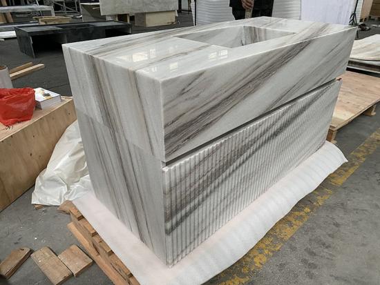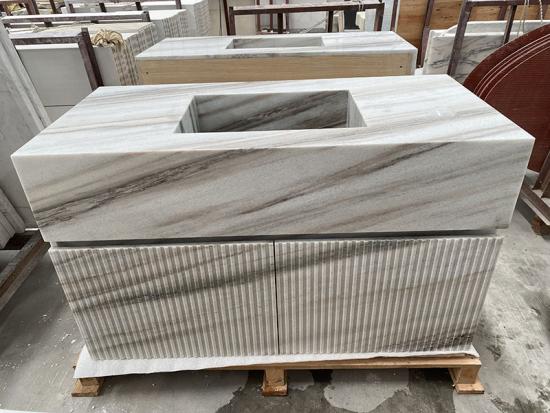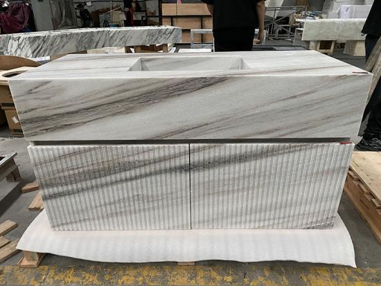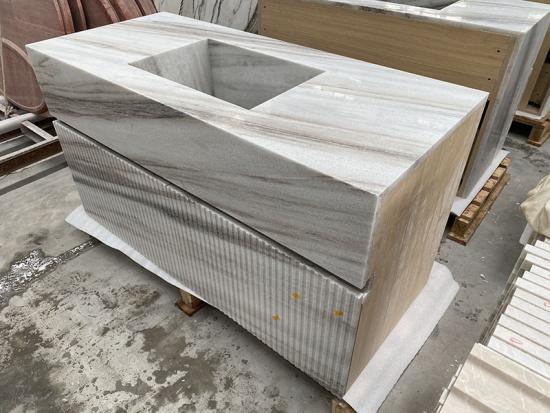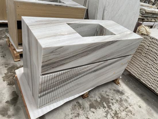Fabricado en mármol blanco Palissandro natural, este lavabo integrado presenta vetas elegantes y una textura suave y de primera calidad, ideal para la decoración de baños de alta gama. Duradero y elegante, se adapta a villas de lujo, hoteles y baños boutique.