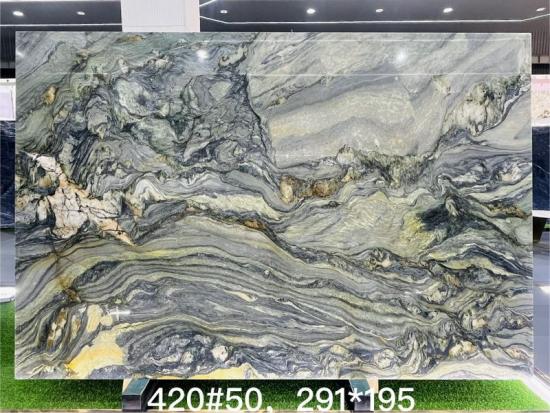Cuarcita Verde Landscape Presenta vetas verdes cautivadoras sobre una base de cuarcita duradera, ideal para crear paredes y encimeras lujosas y de sensación natural en espacios residenciales y comerciales de alta gama.