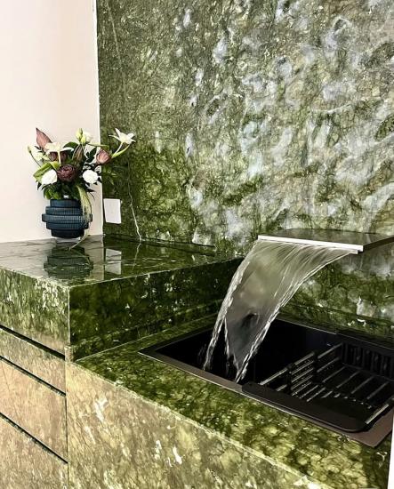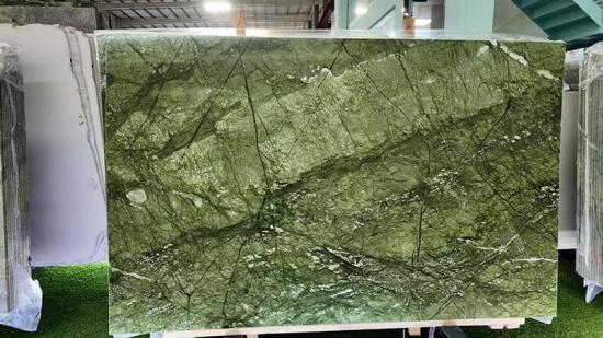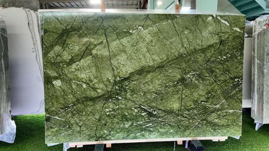 Mármol Verde Ming Sus elegantes tonos verdes y exquisitas texturas lo convierten en una opción popular para diversos proyectos de diseño de interiores. Su exuberante color base, similar al césped, adornado con sinuosas vetas verde oscuro y delicadas manchas blancas, combina a la perfección la vitalidad natural con un lujo discreto, convirtiéndose al instante en el punto focal de cualquier espacio.